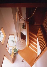 ・ 一般的に雪国のすまいづくりは南側を開放して明るい住まいを作らせていただくのであるが、O様はむしろ直射日光の入らないように南側に窓を取らないリビング空間を所望された。すかさずやって来たネーミングは異邦人ならぬ居包陣であった。