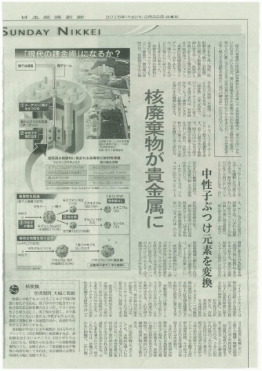・ 日経新聞20150222(日)SUNDAY NIKKEI欄には「核廃棄物を貴金属に!現代の錬金術になるか?」中性子をぶつけて元素を変換!と言う記事である。