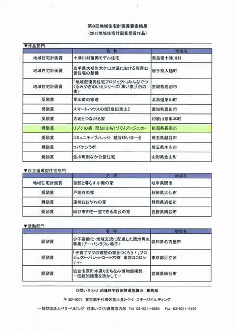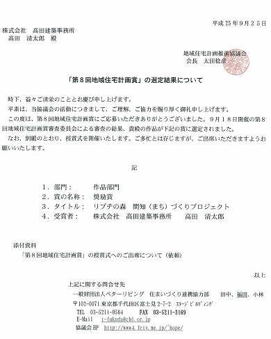 ・ 2013年9月25日、地域住宅計画推進協議会主催「第8回地域住宅計画賞」において、(株)高田建築事務所は、2013第8回地域住宅計画賞作品部門で「リプチの森 間知(まち)づくりプロジェクト」は奨励賞を受賞することが出来た。