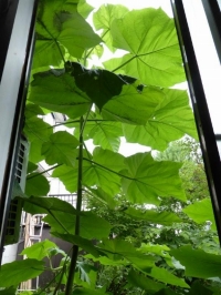 桐の葉が窓の外に大きく広がっている!グリーンアンブレラは涼みを作ってくれる!