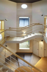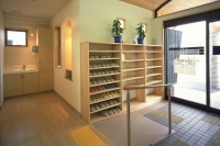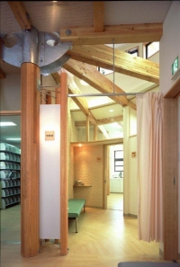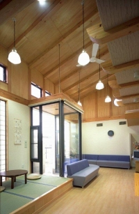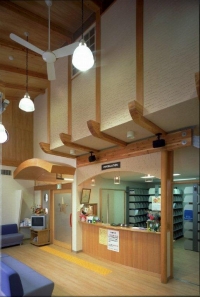 受付待合スペース:構造木材は飴色に仕上がっている。