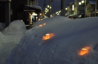 * そんな大雪の中で2月6日の月曜日には宮内商店街に街角キャンドルが映えた。昨年の10月には上組小学校の6年生の児童がまちかど美術館と称して自分たちの作った作品を宮内駅から宮内商店街の雁木空間にて展示して町に賑わいをもたらすことが出来た。今回はその第二弾であった。