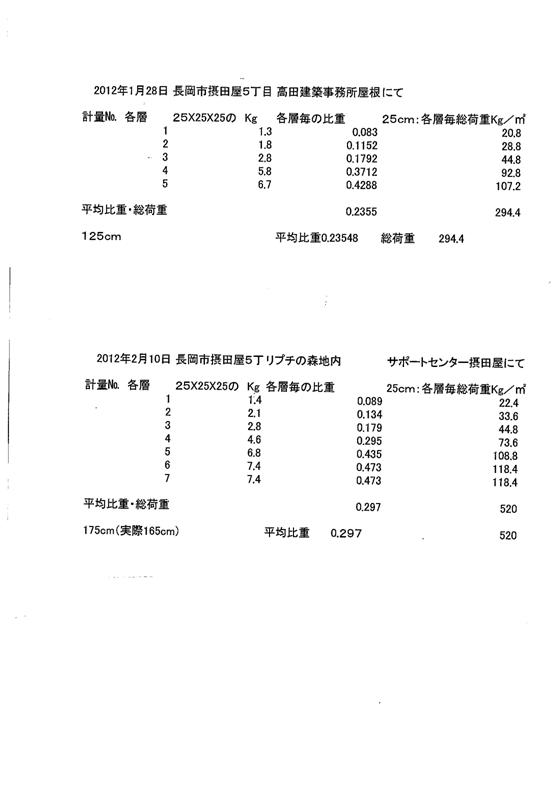 全体比重は平均して0.297となり限りなく0.3に近づいてきた事になる。(比重0.3は建築基準法で決めている多雪地域の比重係数でもある。パウダースノウの地域の比重は0.2であるから、よほどの重さである。しかし、その荷重に近づいた。)