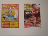 元さんチラシは迫力満点! そろばん川柳に思わず笑顔が! 自慢の玄関でパチリ!