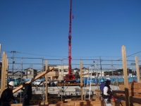 丁度今日(11月27日)からサポートセンター川崎プロジェクト(SCKP)の建て方が始まった。寒さはあるが朝から晴天である。SCKPは地域交流スペースを持った地域密着型介護福祉施設である。25t大型クレーンが設置され順調にプレカット資材が組み立てられていく。現場を見に来られた施主様のSさまの感想は「速いね!・・凄いね!」であった。