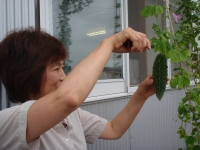 ついにグリーンカーテンからの収穫が始まった。 見事になったゴーヤに神林女史もご満悦!