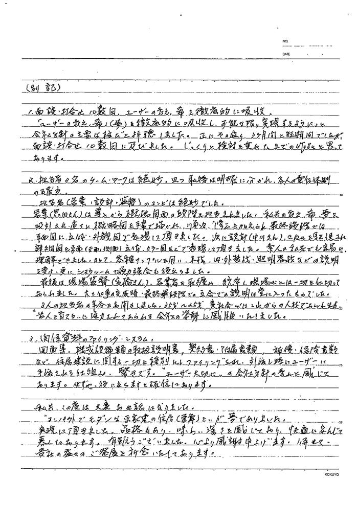 完成した巣舞をお引き渡した後に届くアンケートはとても刺激的である。学校であれば通信簿でもあるからだ。通信簿は成果評である。やってきたことに対する評価である。