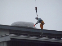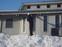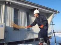 弊社プレカット工場の屋根は自然滑落雪方式をとっている。屋根板金が錆びると中々落ちない。昨年末に雪対策として錆び付いた板金を張り替えることにした。錆びにくい鉄=ステンレス製を採用することにした。張り替えた年は、降り始め雪と馴染まず落下し難いと言われている。更に暖気の時の雪であれば降る先から落ちてくれるのであるが、外気温が零下にもなると雪は鉄板に表着して落ちなくなる。(特に零下4度C以下になると金属はものを吸着する力を持つといわれている)