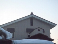 勾配屋根は傾斜がついているから止まる事はしない。しかし屋根棟は水平である。そこに溜まった雪は中々落ち難い!そこで雪国人の知恵で雪割をつける形になる。デザイン上いいばかりではないが、落雪式では避けて通れない処方でもある。