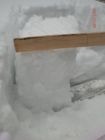 サンプルは250mmX250mmX500mm(H)を計って32倍して1㎥換算をする。新雪なら、100kgもないのであるが、計測すると300kgを楽に超えてしまっていた。今回も350kgであった。重い雪である。
