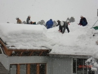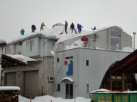 冬になると制限されるアウトドアスポーツに代わって(?)雪屋根登山とスタッフの結束力は高まる。普段、机だけに向っている人々にとっては気分転換にはなるが重労働に変わりはない。
