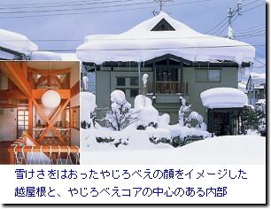 月夜の晩、ぽってりつもった屋根の雪がシルエットに描き出されたとき、長く寒い雪国の風景が妙に温かでもあるのです。やじろべえ住宅は、耐雪工法という構造的ハードをカバーするのみならず、雪国の情緒ある風景づくりにも一役買っている建築工法でもあります。