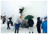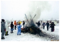 我が町内の塞の神が終焉する夕方に隣町内の塞の神が着火される。同時に花火打ち上げを楽しむのである。雪上花火も又楽しからずや!である。