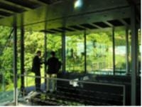 ・ 全面ガラス張りはプライバシー問題だけでなく、熱環境の問題を解決されなければならない。R-128の必要電気エネルギーは太陽電池によって作り出されると言う。また、窓から侵入する太陽エネルギーは天井パネルに吸収され導水管を通って1Fの蓄熱槽に運ばれて必要に応じて利用される。暖かい空気をダイレクトゲインする方式でもある。