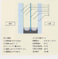 ・ 全面ガラス張り住宅は一般的にはエネルギー負荷が大変大きい事になる。しかし、R-128のガラスの熱貫流率(U値)は0.45W/㎡・Kと極めて高い断熱性能を実現している。日本では考えられないガラス構造でもある。その形状は両面に透明強化ガラス10ミリ(外部側・Low-Eコートを溶着)と8ミリ(内部側)の中心に遮熱Low-Eコート付きフィルムを挿入する。その両側にはクリプトンガス層13ミリを2層設ける。熱伝導率は空気1に対してアルゴンガスは0.6クリプトンガスは0.3である。空気に対して3倍も熱抵抗が強い事になる。日本で使われている複層ガラスのU値が3.0位であり、トリプルガラスでも1.9である。Low-Eガラスを使用しても1.6であるから熱貫流率(U値)は0.45W/㎡・Kは、いかにランクの高いものであるか分かる。