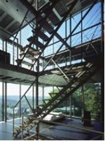 アプローチは全てグレーチングであり、ブリッジも含めてスケスケである。結構な急階段坂道。いつの間にか雨の日や雪の日は?風が吹いたら?勝手な心配をしてしまっていた。4ヶ所に屈折するアプローチは夫々の景色を変えて見せてくれた。まるで日本庭園の手法のようにも感じる。