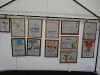摂田屋5丁目公民館内部の作品陳列 子供たちの作品がテントの中にも! 落書きコーナーに集まる子供たち!