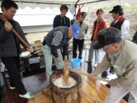恒例の餅つきは公民館の隣にできたばかりの駐車場で行われた。30台近く駐車できる広々広場として活用された。小豆餅・黄粉餅に芋煮汁が振舞われた。