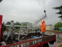 テンセグリック・システム(斉藤先生の命名)で造られたステンレス製のモニュメントはきらきらと輝いており、最高高さ5.2mの先端についたトップコーンは天空に向ってまさに打ち上げられんと時を待っている弓矢の様であった。