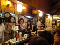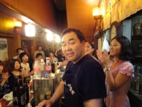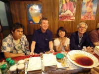 二次会は宮内商店街飲食店で再乾杯! カウンター内まで!店主はアリャ! 秋山孝先生〔右〕とその教え子たち