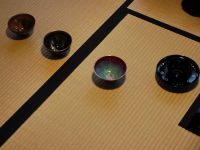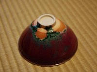 掛け軸は、大徳寺無学書による「偃蓋重々拂瑞雲(えんがいじゅうじゅうずいうんをはらう)」は新年にピッタリで新しい年に迷いやマイナス要因を引きずらないで、払拭し心新たに向かいたいものであると言う先生からの注釈が有った。柳掛けも水墨画のように微妙なカスレを表現していたように感じた。床飾りを鑑賞した後、四畳半では天目茶碗で濃茶を頂くことになった。三種類の天目茶碗は、孔雀天目・油滴天目・禾天目と言われるものであった。どれも素晴らしく私にとっては滅多に使うことなどできない茶碗であった。天目茶碗とは、天目釉と呼ばれる鉄釉をかけて焼かれた陶器製の茶碗のこと。唐物と言われており、今回使用された三碗は南宗の時代の作だとも聞いた。孔雀天目茶碗は、正に孔雀が羽を広げた姿である。天目台「七宝」に載せられて出されたお茶には、初めてのスタイルであったからかなり緊張もした。いずれの茶碗にも幽玄な光沢が眩かった。そして、八畳間に移動して薄茶点前を楽しんだ。