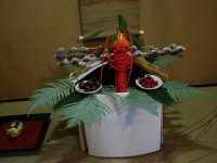 正客さんのNさんのお話では、利休さんの命日:旧暦2月28日(新暦では表千家3月27日・裏千家では3月28日)以前には初釜以外にこれと言って大きな茶会は行われないことになっているらしい。つくばいで手と口を清めた後、二畳間を通って四畳半の小間に導かれた。床飾りは昨年と同様に「蓬莱山飾り」であった。とても正月に似合う華やかさと目出度さを彩る材料の組合せであった。