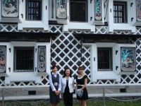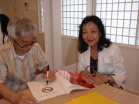 見城美枝子さんも麗〔娘さん〕と来館 見城先生へサインする秋山先生 APMから徒歩5分,サフラン酒の鏝絵の蔵