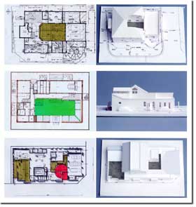 計画中のO邸は、ツインのコートハウス。玄関前にとられたコートは車庫と居間に囲まれ、さらに居間から南に開かれたコートは塀で囲われています。2つのコートは、母屋と車庫上に設けられた二世帯住宅の居住空間との程よい距離を作り出してくれてもいます。