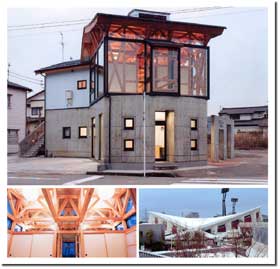 2階が木造のハイブリッド構造外観(上)、木造小屋組みを表した内観(左)、シェル工法の新潟市体育館(右下)