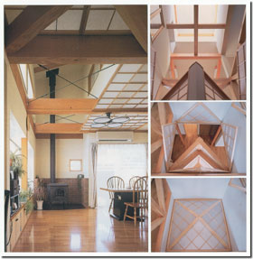 K.Aさんの場合は、三角の形をした四枚の建具で四角錘を造り、縦型に開閉できるようにしてみました。玄関ホールから見るとピラミッド形の光天井モニュメントにもなって空間に華を添えてくれています。