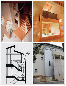 斜め段板の階段(左上)、階段下の光のステージ(右上)、天窓を持つ二重吹き抜け階段室断面(左下)と外観(右下)