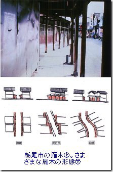 上越市の高田の雁木や栃尾市の雁木はとても有名です。年輪を感じれば感じるほどに良い空間は雁木にぴったりです。直線の雁木も各戸の微妙な作り方が重な り合っているので遠くで見るとまるでモザイク調の深みを持っています。ちょっと曲がりくねった雁木に至ってはなんともいえないゆれを覚えさらに居心地の良 さを提供してくれます。そして、雁行形に平面配置された雁木に至ってはまさに芸術空間といってよいかもしれません。