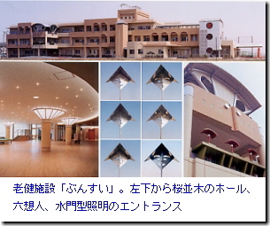 施設機能に加えてデザインボキャブラリ―のもう一つに「その土地の風景」があリます。そこで「その土地の風景」があります。「分水堰(せき)」は越後平 野の最大の治水事業です。そこで堰のモチーフをふんだんに取り入れ、特に外観にはデフォルメした「水門」をちりばめました。また、分水桜まつりで有名な桜 並木や「おいらん道中」も取り入れました。一階の作業訓練室兼ホールには、丸柱を桜の木に見たてて、だ円形の照明器具である枝は、天井まで伸びています。 天井面にちりばめられた華やかな照明はまさに桜の花。おいらんの外八文字歩きにあやかって、だ円形の照明器具はニ秒と言う時間差で八文字を描く様に次々と 点灯し、二十秒後にはエレベーターの入り口まで到達します。