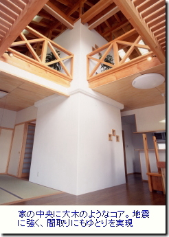 閉じる所はしっかり閉じ、構造的部分をもたせるため中央にコンクリートのセンターコアを作り地震に対する水平力を受け持たせました。これにより、開口部 (窓)を大きくとることができ、広々とした間取りでゆとりが生まれました。(ちょうど高層ビルのエレベーターコア-とカーテンウォールのような関係です)