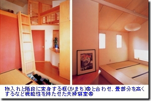 さらに、寝室については全体の面積的制約から、大きさにして約七畳大が精いっぱいでした。固定式のベッドは避けたいと希望されていましたが、普通畳ではメ リハリがつかない。思い切って畳四畳分そっくり四十センチ上げて畳ベッドにする。並列に布団を敷くと一畳丈では布団がこぼれる。そこで三十センチ幅ほどの 板部を作る。(小上がり板を連想していただければ結構です。)この部分は普段は畳の下に収納されており、布団を敷くときに引っ張り出して使うことが出来 る。ここは単なる箱ではなく、ふたを開ければ手編み毛糸の収納庫でもあります。ふたの裏には仕切りが作られており、建て掛けると小屋裏への階段にもなりま す。可動という考えを持ち込むことによって、平面的だけでなく立体的に空間を遊ぶことができるのです。七畳という狭さを感じさせないばかりか、何倍も楽し ませてくれる豊かな寝室空間が誕生しました。