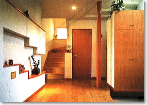 例えば玄関に下足入れが、必要なのはだれでもわかっていること。しかし、三文判入れやメモ文具は以外に忘れられている。ちょっとした引出しがあるだ けで、急な配達物があっても、あわてて印鑑を探したりする手間が省けます。ほかに玄関にあると便利なものは、帰宅した際、ポケットの持ち物(かぎや定期な ど)を置いておく棚。この棚を「備忘棚(びぼうだな)」と呼び、忘れ物防止の役割を持たせてはどうでしょう。家族の人数分、色分けされた小さな棚があれ ば、くらしも楽しくなり、インテリアにもなります。 また、脱衣室に下着収納スペースが無いのも意外に不便です。室名自体に問題があるのかもしれません。 衣を脱ぐ室と書くから、次に続く作業は洗濯…だから洗濯機が有る。裸のままで家の中をうろうろでもしていたら、年ごろの子供から、ひんしゅくを買います。 今度から、設計図には、脱いで着る部屋という意味で『脱着室』と書けば下着収納棚が取れそうです。使い勝手は各人の個性。、こうだという定番はなくても自 由な発想でよいのです。 そう考えると、ご主人用のクローゼットは本当に2階の寝室の奥に必要なのか?「ただいま」と帰ってきたご主人は、奥さまのいるダ イニングへ直行。つまりそこで着替える。朝も、ダイニングで食事をとり、そこで着替えて会社にでかける。こういう方の場合は、ダイニングや居間に着替え コーナーをもつことも考えられるでしょう。つまり収納とは単に物を置く場所ではなく、おのおののすまい方、生活スタイルそのものなのです。 1ヶ所にまとめて収納するのではなく、必要なところに必要な収納を。収納上手は、生活上手。壁面やコーナーを上手に活用すれば、空間に無駄がなくなり、使 い勝手も良くなり、暮らしにゆとりが生まれます。