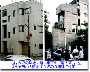 2階は7畳のリビング・キッチン。中3階は7畳の寝室。4階は屋上テラス付き、5畳の子供室。これは、35年前の建築例。「塔の家」と名付けられて 地域のシンボル性も高く、建築界に話題をもたらしました。何も一軒の家で機能を完結する必要はない。周辺の街全体を家と考えて、道路は廊下、レストランは みんなの食堂、喫茶店は書斎、銭湯は大きなバスルーム。発想を変えれば、便利で豊かになります。一方、長岡市のK氏の場合は19坪(62、7㎡)の狭い土 地でした。当初、広い郊外に出ようと考えたのですが、この話に勇気付けられ、最終的に現地で建て替えを決心しました。幸い、建ぺい率80%地域だったの で、1階の建坪は15坪(49、5㎡)が可能。容積率は200%で、延べ面積は38坪まで可能でした。車庫面積の特典を考慮すると、総3階建て、延べ45 坪(148、5㎡)が建てられる、と話して計画に取りかかりました。1階に車庫併設の玄関ホール、バス・サニタリー。2階はトイレと洗面、家族全員が集う 20畳のワンルームLDK。3階は8畳の主寝室と6畳の子供室、3畳の書斎を配置。幸い、隣家の庭に面していたので圧迫感もなく、市街地型の住まいが誕生 しました。このようにちょっと考え方を変え、知恵を働かせるだけで、狭い土地でも心豊かな楽しい生活ができます。土地も地球の大切な資源の一つ。住み慣れ た土地を狭いという理由だけで簡単にあきらめないでください。家は小さく生んで、大きく育てましょう。