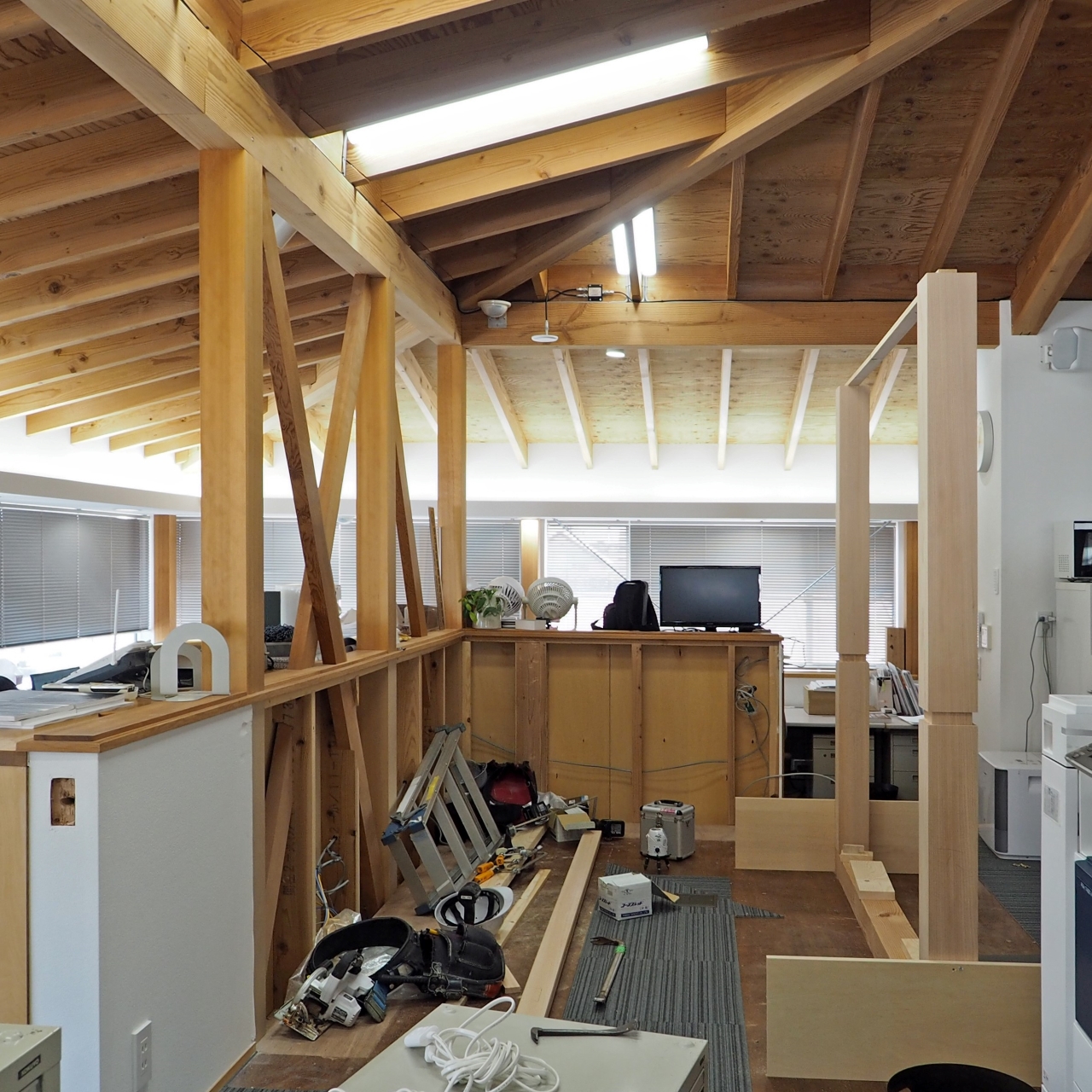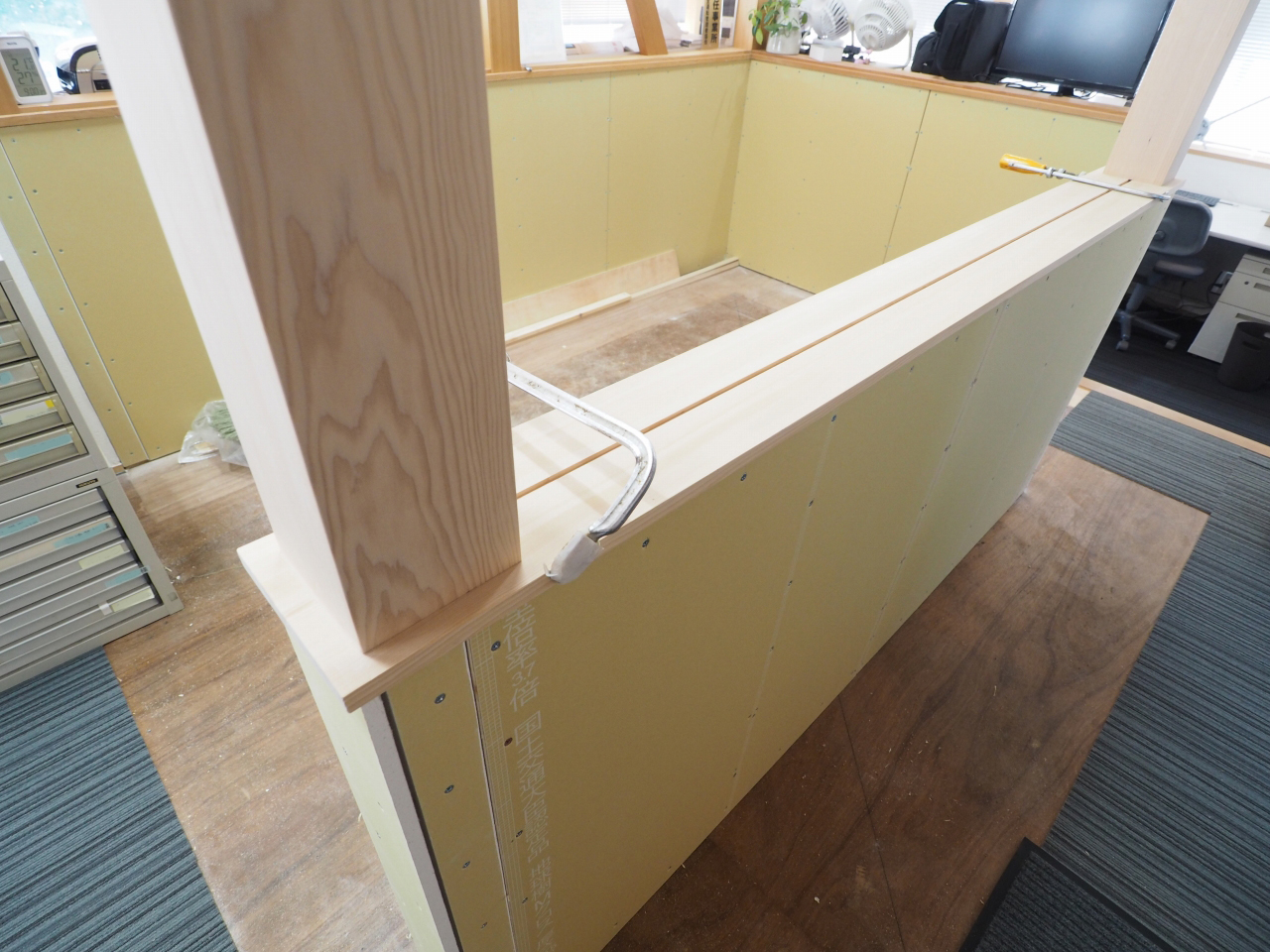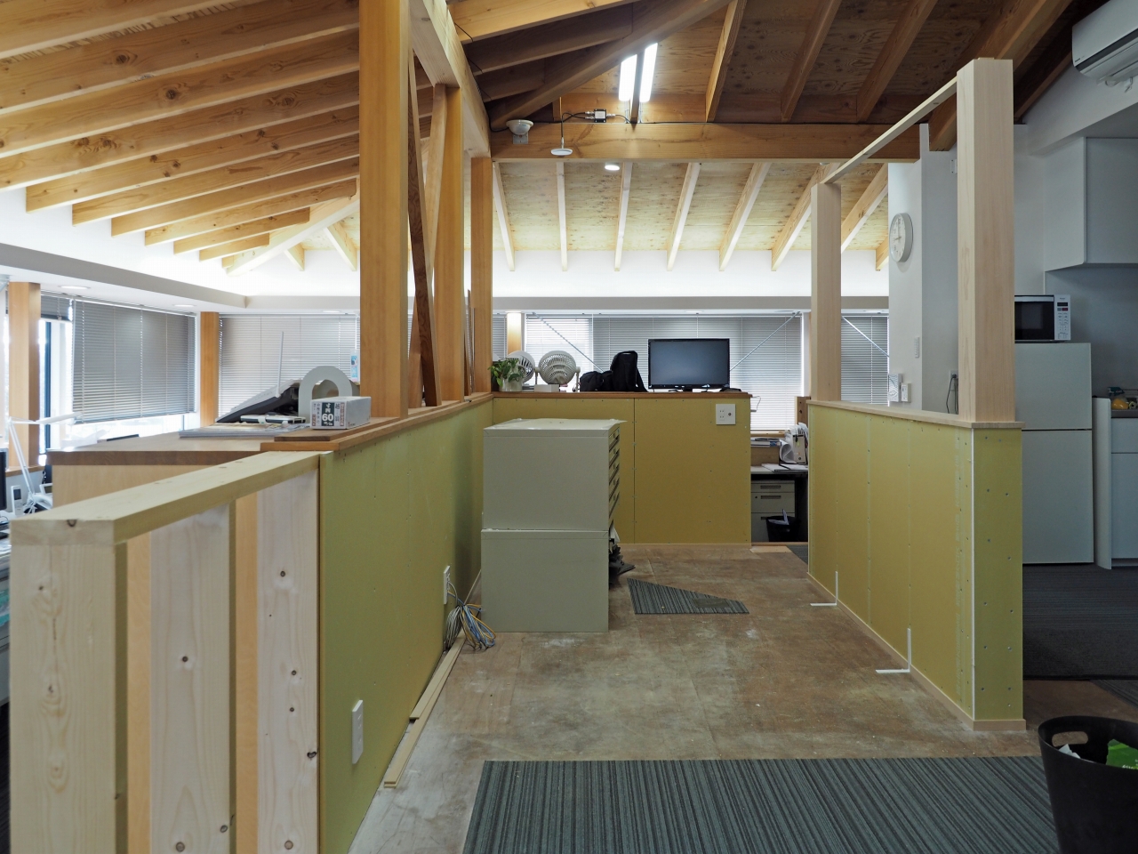 まずは本棚を撤去。スタッフの出入りが多い場所なので、目隠しとなる壁を設けていきます。