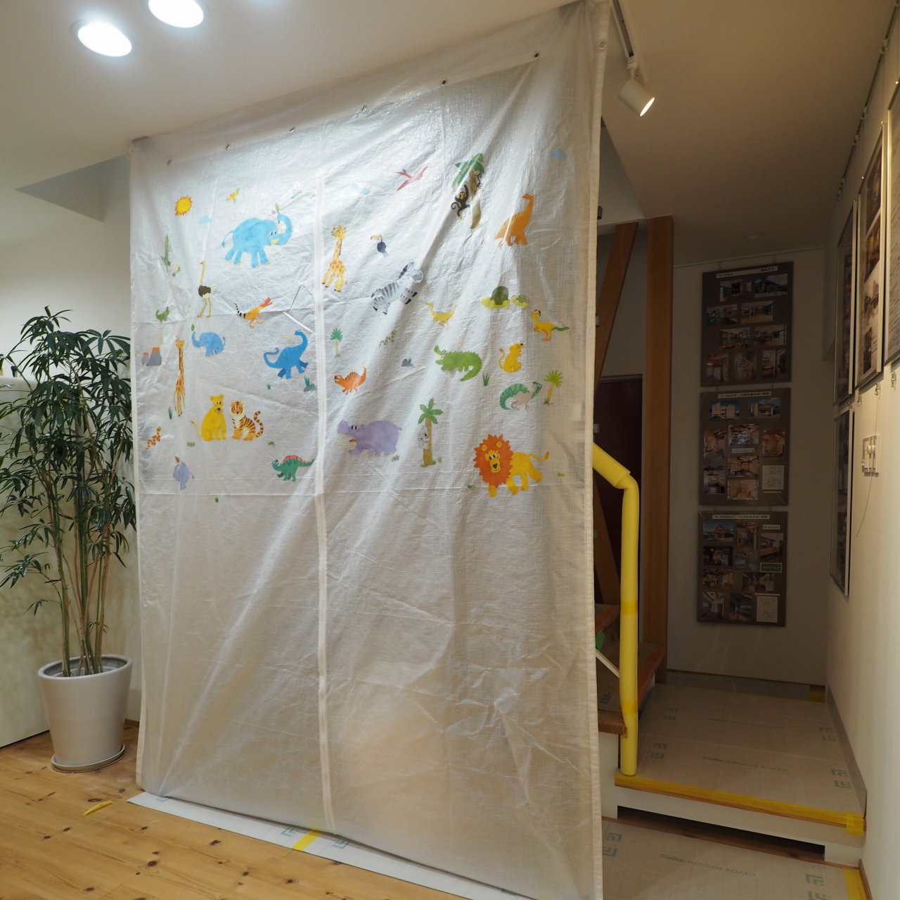 スタッフがお客様の目に触れるホールの養生シートに可愛いシールを貼ってくれました。
