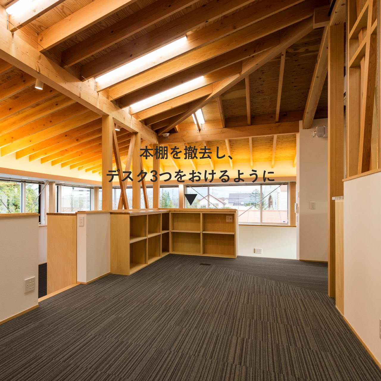ミーティングテーブルと本棚スペースにデスク3つ分のスペースをつくります。