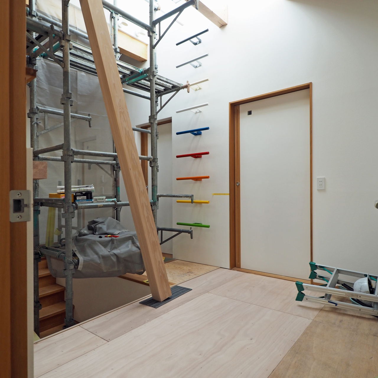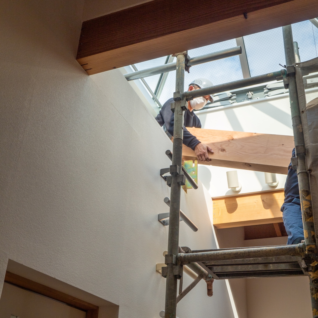 2月28日、まずは階段ホールを養生し、足場を架けていきます。