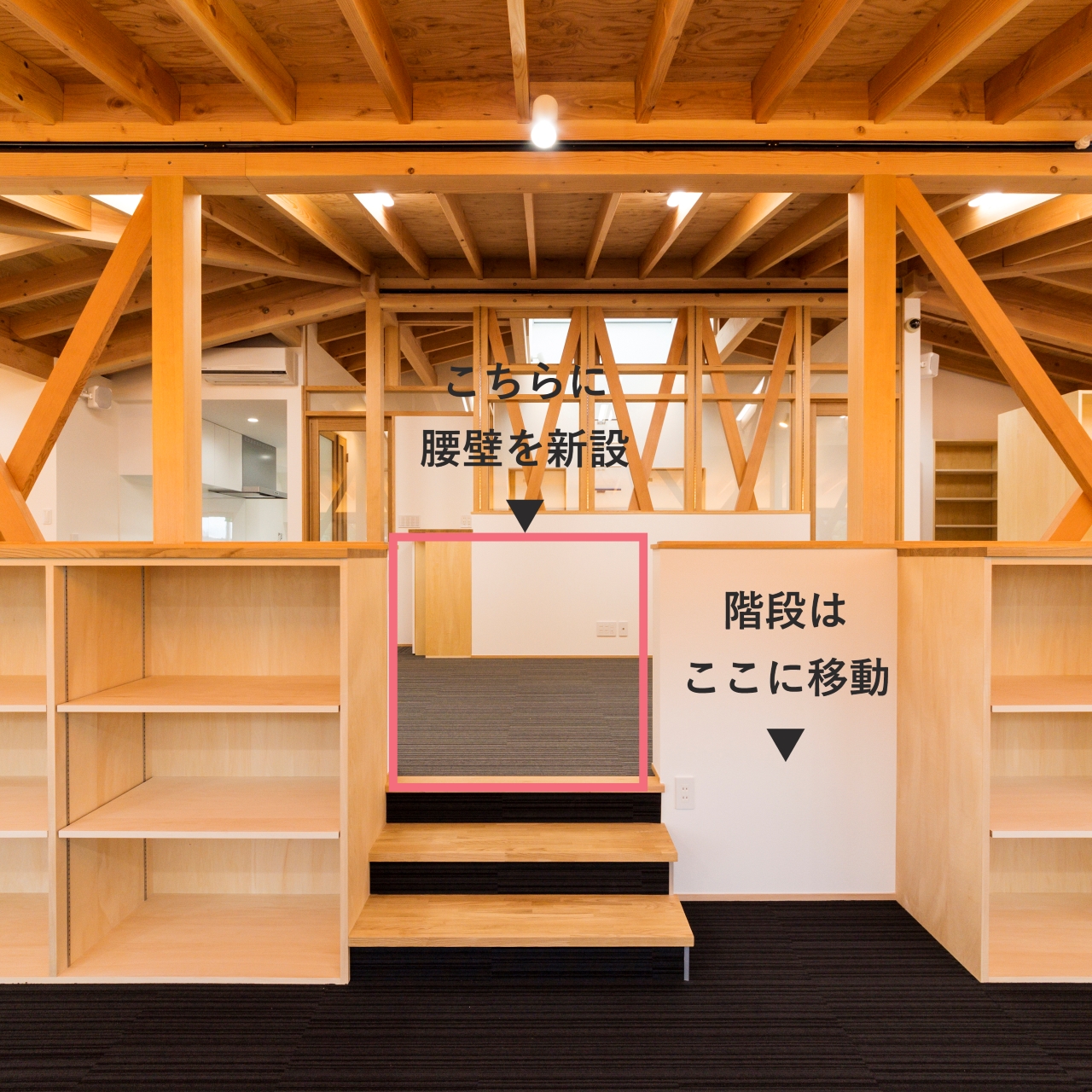 このままの幅ではデスクが収まらないので、スキップフロアの階段を移動して、壁を延長。