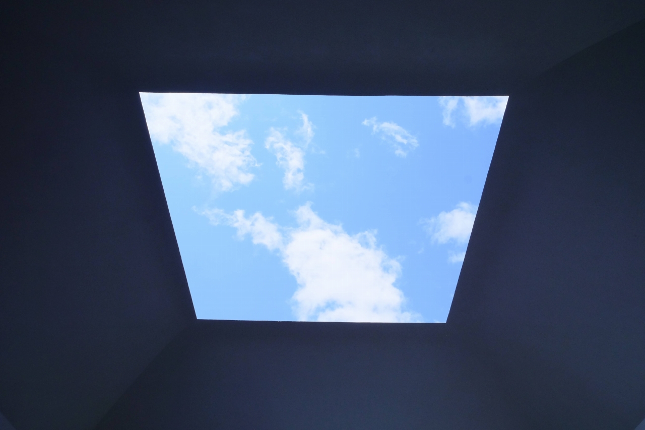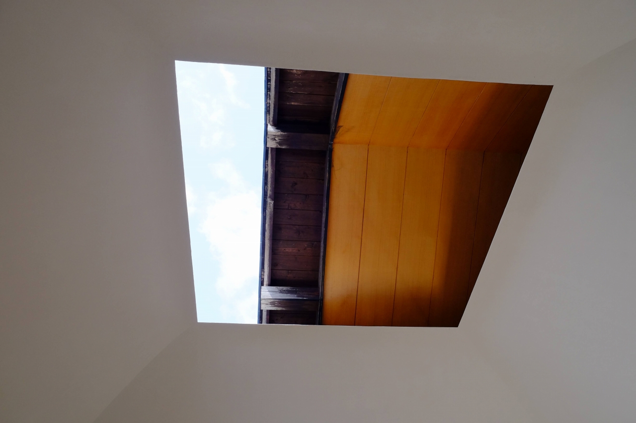 天井には四角形の開口があり、室内にいながら空を眺めることができます。
