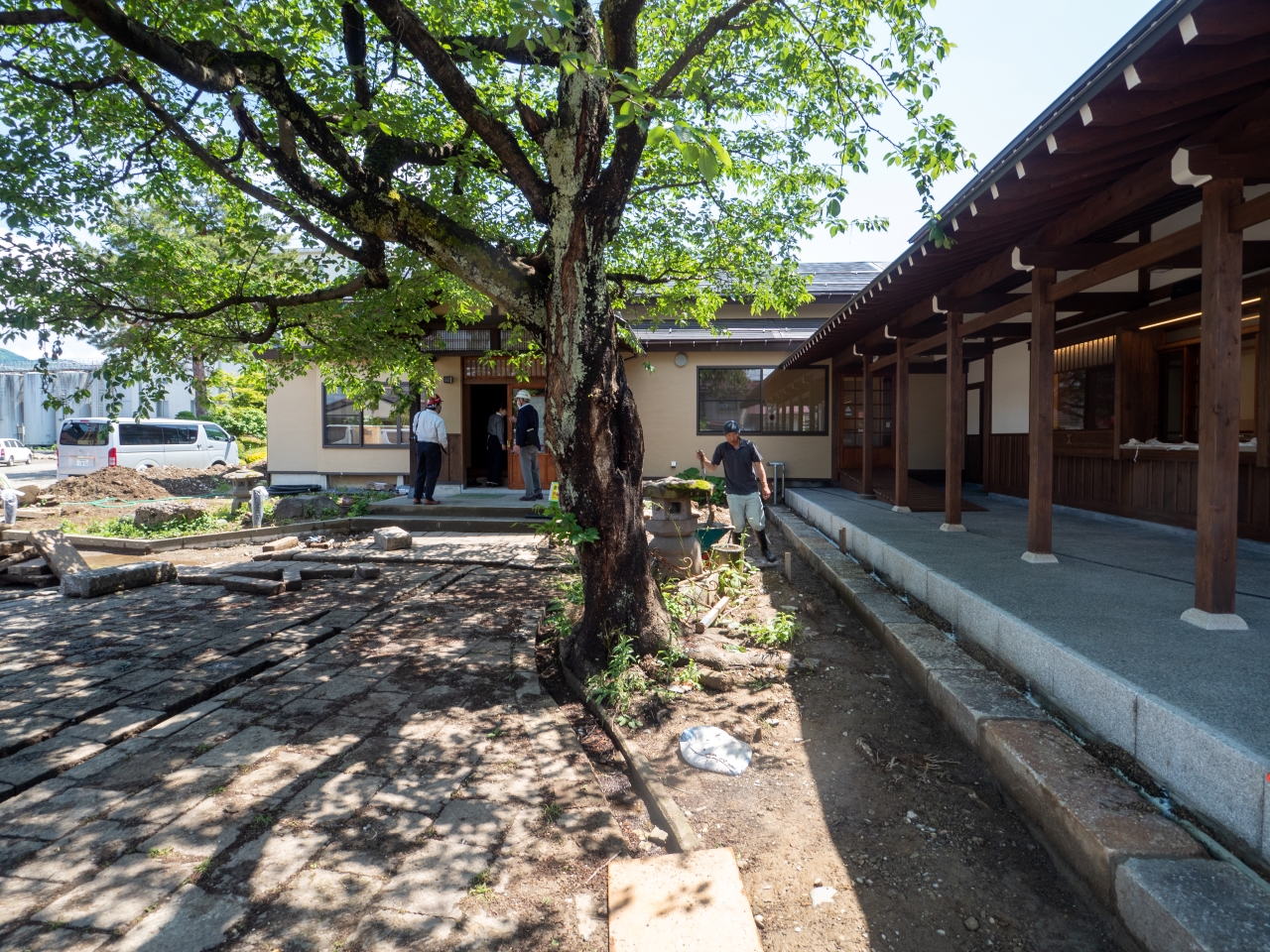 朽ちていた柱を取り払い、新しい柱で補強しながら建物を復活させています。