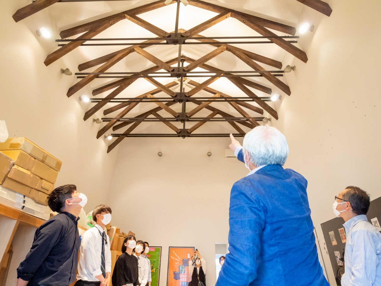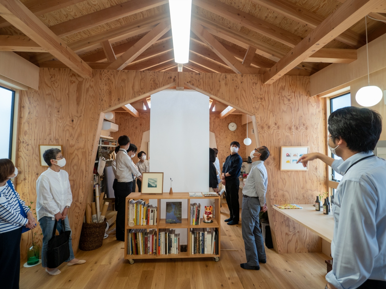 1階はキッチンと客席を備えたスペース。2階は現在、木版画の『atelier M』さんの工房となっています。ここでは社長による解説。パネル化された構造がそのままデザインとなったスリーヒンジ構造です。
