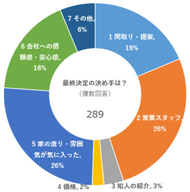 住まいづくりを進める中で、会社をタカダに決める決め手は「営業スタッフ」と「家づくり・雰囲気が気に入った」がそれぞれ26%で一位でした。続いて「間取り・提案」19%、「会社への信頼感・安心感」が18%で続きます。