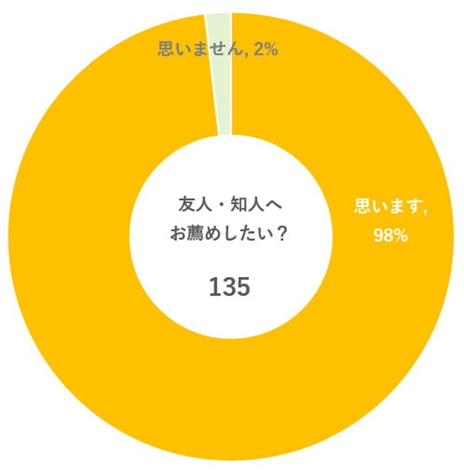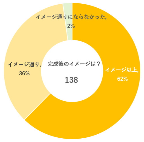 「イメージ以上」62%、「イメージ通り」36%、と続きます。アンケートが来るときにイメージ以上の欄がチェックされているととても嬉しくなる項目です。