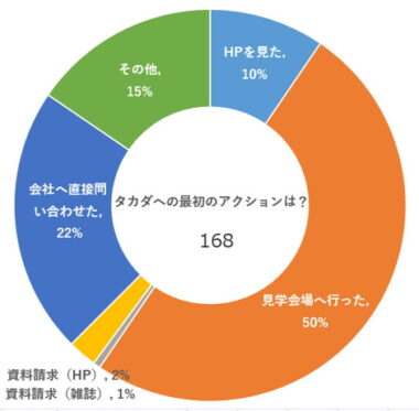 見学会へ行ったが50%で最多になります。実際の建物を体感されたいという方が多いです。特に弊社は千人鮮色をスローガンに、お客様各々で全く違うデザインになりますので、毎回見学会を楽しみにされる方もいらっしゃいます。次に会社へ直接連絡が続きます。