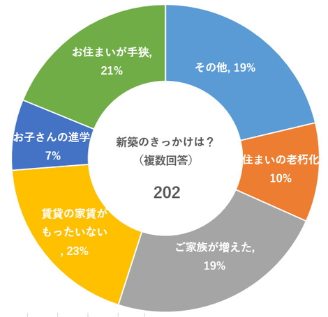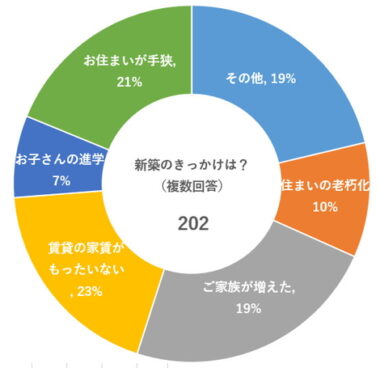 きっかけは様々ですが、ご家族が増えた+お住まいが手狭で40%になっています。家族構成の変化をきっかけにされている方が多いです。
