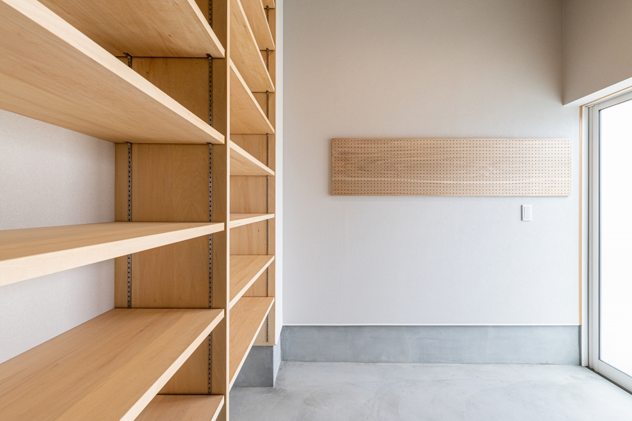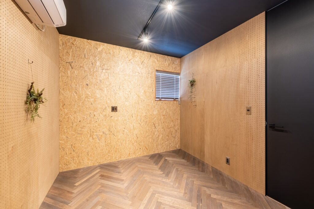 有孔ボードとOSB合板と組み合わせた個性的な空間。